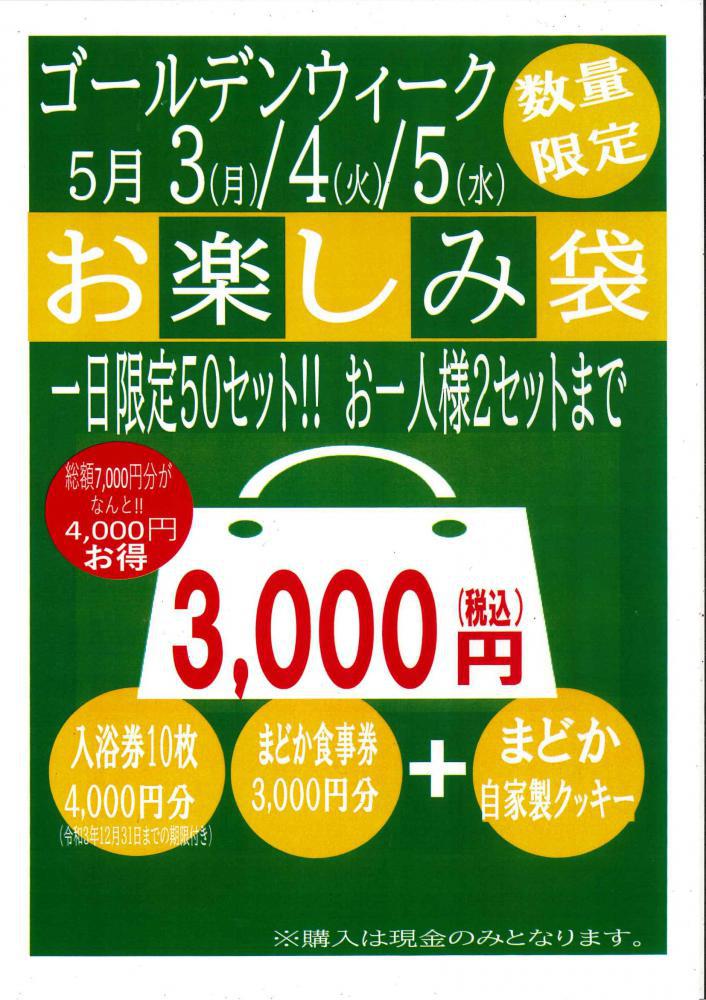 まどかゴールデンウイーク温泉入浴券特売5月3日(月)・4日(火)・5日(水)の3日間限定1日100冊!!通常11枚→15枚で4,000円税込