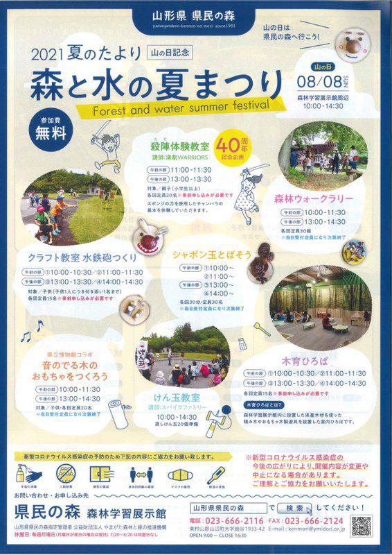 8月8日(日)は山の日です。県民の森では「森と水の夏まつり」を開催します。親子で楽しめるイベントが盛りだくさん!山の日は県民の森へ行こう! 『森と水の夏まつり』□日 時 令和3年8月8日(日・山の日)□時 間 10:00〜14:30□場 所 県民の森森林学習展示館周辺□イベント内容 殺陣体験教室 クラフト教室 水鉄砲つくり シャボン玉とばそう 森林ウオークラリー 音のでる木のおもちゃをつくろう けん玉教室 木育ひろば ※事前申し込みが必要なイベントもあります。詳しくは県民の森にお問合せ下さい。□お問合せ先 県民の森森林学習展示館 電話:023−666−2116 FAX:023−666−2124 また、県民の森では様々な行事を開催しています。自然を満喫できる県民の森に出かけてみませんか♪