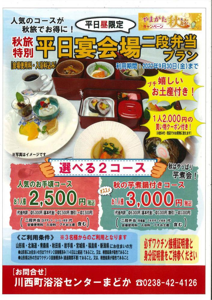 秋旅キャンペーン 平日宴会場二段弁当プラン★選べる2コースプラン秋旅キャンペーン利用して平日の日中お得なプランでゆっくりすごしませんか?〜人気のお手ごろコース〜 ●2,500円税込み【(二段弁当・デラックスデザート・コーヒー)・会場使用料 入浴料・おプチ土産付き】代金内訳:@5000基本代金-@2500割引=@2500※他、お一人様2000円クーポン付き(お飲み物・お買い物として使用できます)〜秋の芋煮鍋付きコース〜 ●3,000円税込み)【(二段弁当・芋煮鍋・プチデザート)・会場使用料・ 入浴料・プチお土産付き)】:代金内訳@6000円基本代金-@3,000割引=@3,000※他、お一人様2000円クーポン付き(飲み物:お買い物に利用できます)※どちらのコースも利用条件として ワクチン接種証明書・身分証明書が必要となります!!※予約となります。TEL0238-42-4126まどかまで!!