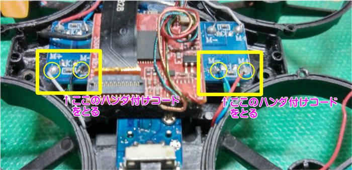 ドローンHS420モーターコードを基板からハンダを溶かして取る作業しなくちゃ