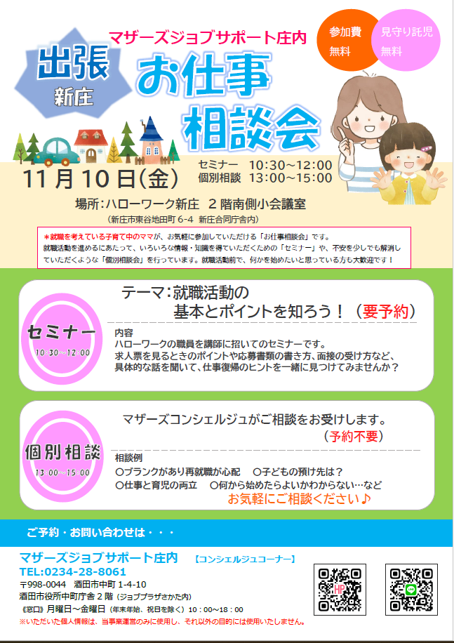 ハローワーク新庄『おしごと相談会』を開催します。【開催日】11月10日(金)【開催場所】ハローワーク新庄 2階南側小会議室【内容】10:30〜12:00 セミナー ※お申込みが必要です。「就職活動の基本とポイントを知ろう!」ハローワークの職員を講師に招いてのセミナーです。求人票を見る時のポイントや書類の書き方、面接の受け方など、具体的な話を聞いて、仕事復帰のヒントを一緒に見つけてみませんか?                13:00〜15:00 個別相談会※どなたでもご利用いただけますお申込みは不要です。・おしごとに関するお悩み・子育てに関すること・仕事と家事、子育てとの両立      など、お気軽にご相談ください。  ♪お子さんと一緒に、お気軽にお越しください♪お子さんと同じお部屋でセミナーを受講し、相談することができます。保育スタッフが、ママをサポートいたします。 ★★受講者の皆様へお願い★★場合によっては、体調の確認をさせていただくことがございます。状況によっては、ご案内の変更をさせていただきます。あらかじめご了承ください。★★ーーーーーーーーーーーーーー★★ お問い合わせはマザーズジョブサポート庄内TEL:0234-28-8061メールでのお申込みはコチラ