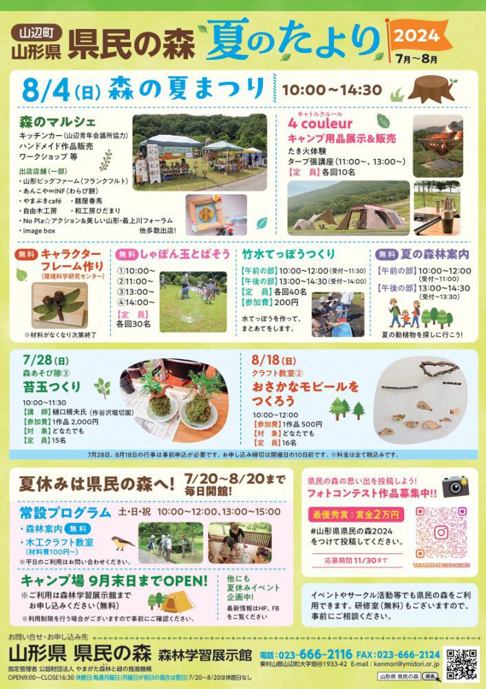 夏休みは県民の森へ!8月4日(日)10:00〜14:30県民の森にて「森の夏まつり」が開催されます。キッチンカーの出店やキャンプ用品の展示&販売、竹水てっぽうづくり、夏の森林案内など自然を楽しめる内容が盛りだくさんです!8月4日以外にも常設プログラムがございますので、夏休みはぜひ県民の森へお越しください(^^)/最新情報は県民の森HPをご覧ください。https://www.ymidori.or.jp/kenmori/