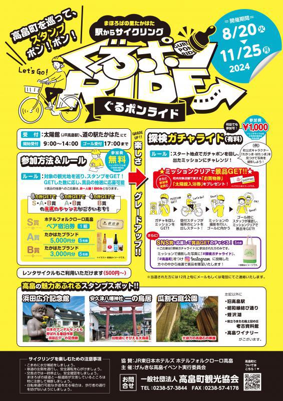 ↑PDFデータはこちらから『まほろばの里たかはた駅からサイクリング「ぐるポンライド」』を開催します!浜田広介記念館や瓜割石庭公園など、対象の観光地を巡りスタンプをゲット!スタンプの数に応じ商品の抽選に応募していただけます有料の「探検ガチャライド」は、ガチャポンを回して出た「ミッション」にチャレンジしながらゴールを目指しますミッションクリアで景品ゲット!さらに、参加者全員に町内対象店舗で使える「お買物券」と「太陽館入浴券」をプレゼントいたします!また、受付場所の太陽館・道の駅たかはたにはレンタサイクル(500円〜)もございます。これから秋にかけ、サイクリングにピッタリの季節となってまいります。サイクリングで高畠町を巡りながら高畠町の観光を楽しんでみませんか?ご参加お待ちしています!◆開催期間 令和6年8月20日(火)〜11月25日(月)◆受付 高畠町太陽館(JR高畠駅)、道の駅たかはた <開始受付> 9:00〜14:00 <ゴール受付> 17:00まで◆スタンプスポットのご紹介@浜田広介記念館 日本のアンデルセンとも呼ばれる童話作家 “浜田広介”の記念館 「泣いた赤おに」「りゅうの目のなみだ」など愛と善意の大切さを伝える、ひろすけ文学の世界に触れることができます。<営業時間>9:00〜17:00(最終入館16:30) 休業日/毎週月曜日(月曜日が祝日の場合は、翌日の火曜日)、祝日の翌日 入館料※本イベント特別料金/大人400円、学生200円、小・中学生100円<スタンプ設置場所> 記念館受付(スタンプ押印には入館が必要です)A旧高畠駅 高畠石を使用したノスタルジックな駅舎跡瓜割石庭公園(瓜割丁場)で採掘された高畠石を使って昭和9年に建造された駅舎。昔利用された電車も展示されています。平成28年に国の有形文化財(建造物)に登録されました。<営業時間> 常時見学可<スタンプ設置場所> 駅舎裏のプラットフォームB昭和縁結び通り 昭和時代にタイムスリップ! 昭和30年代の生活を感じさせる懐かしの通り。各商店の一部に当時の電化製品、雑誌や漫画、お菓子の木型・焼型、全盛期だった映画のポスターなどを展示しています。<営業時間> 各店の営業時間<スタンプ設置場所> 昭和参号館 「高砂屋珈琲店」入口わきC安久津八幡神社 一の鳥居 旧街道にそびえる大鳥居 仙台方面と新潟方面を東西にはしる七ヶ宿街道(国道113号線)に立つ大鳥居。ここからは、太平洋も、日本海も、ほぼ等距離。東北制覇をめざした伊達政宗もここを幾度も馬にのって走ったことでしょう。<営業時間> 常時見学可<スタンプ設置場所> 道の駅たかはたインフォメーション(9:00〜17:00)D瓜割石庭公園 大迫力の高畠石の断崖 大正12年〜平成22年まで採掘されていた「瓜割丁場」の跡を見ることができます。切り立った石の断崖は迫力十分です。旧高畠駅舎はここで採石された石で造られました。<営業時間> 常時見学可<スタンプ設置場所> 入口から向かって正面のトンネル内E蛭沢湖 緑の湖水が美しい人造池 昭和11年着工、13年の歳月で完成した人造湖。春の雪解け水を満々とたたえた湖は、湖畔にそそり立つ奇岩怪岩や松の緑と調和して美しいです。<営業時間> 常時見学可<スタンプ設置場所> 自販機のそばF県立うきたむ風土記の丘考古資料館 縄文時代にタイムスリップ 町内で発見された遺跡の出土品や、縄文時代の住居を展示しています。一万年前の暮らしや集落構造を知ることができます。<営業時間> 9:30〜16:30(最終入館16:00) 休館日/毎週月曜日、国民の祝日【臨時休館】11月5日(火)【臨時開館】9月22日、11月3日(文化の日無料開放) 入館料/大人200円、大学生100円、小・中・高生無料<スタンプ設置場所> 資料館受付(スタンプの押印には入館が必要です)G高畠ワイナリー ヨーロッパ風のおしゃれな外観 北日本最大のワイナリーです 工場内はワインの瓶詰などの製造工程の見学ができ、テイスティングルームでワインの試飲を楽しめる観光客に人気のスポットです。ソフトクリームがおすすめ!<営業時間> 平 日/10:00〜17:00 土日祝/ 9:00〜17:00<スタンプ設置場所> 高畠ワイナリー受付 ◆ぐるポンライドマップ ◆お問い合わせ 一般社団法人高畠町観光協会 TEL:0238-57-3844◆協賛:JR東日本ホテルズ ホテルフォルクローロ高畠◆主催:げんきな高畠イベント実行委員会