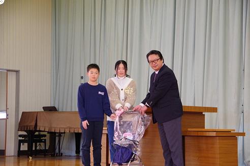今日は、白光園の皆様へのシルバーカー贈呈式。 エコボランティア委員会より報告がありました。今年集まったアルミ缶:171Kg、350mlのアルミ缶11115本分これをお金に換えて、白光園の皆様へシルバーカーの贈呈です。 ちょっと緊張しながら、園長様にお渡ししました。 このシルバーカーは、大変ありがたい。自分も蚕桑出身なので、皆さんの優しい気持ちが嬉しい、ぜひ将来白光園で働いてくれる人がいると、なおうれしい…というようなお話をいただきました。 毎週金曜日私たちが持ってくるアルミ缶は、シルバーカーに姿を変えて、たくさんの方を幸せな気持ちにすることでしょう。アルミ缶は、「しあわせの素」ですね。ぜひずっとしあわせを送り続けられるこぐわっ子たちでありたいですね。