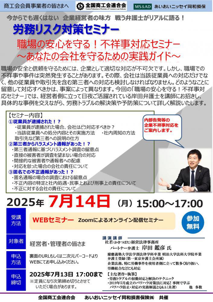 職場の安全と信頼を守るためには、企業として適切な対応が不可欠です。しかし、職場での 不祥事や事件は突然発生することがあります。その際、会社は当該従業員への対応だけでな く、他の従業員や取引先を含む第三者への対応も検討しなければなりません。どのようなことに 留意して対応すべきかは、事案によって異なります。今回の「職場の安心を守る!不祥事対 応セミナー」では、経営者側に立って日夜ご活躍されている岸田弁護士を講師にお招きし、 具体的な事例を交えながら、労務トラブルの解決策や予防策について詳しく解説いたします。※申し込みはチラシの裏面をご覧ください。