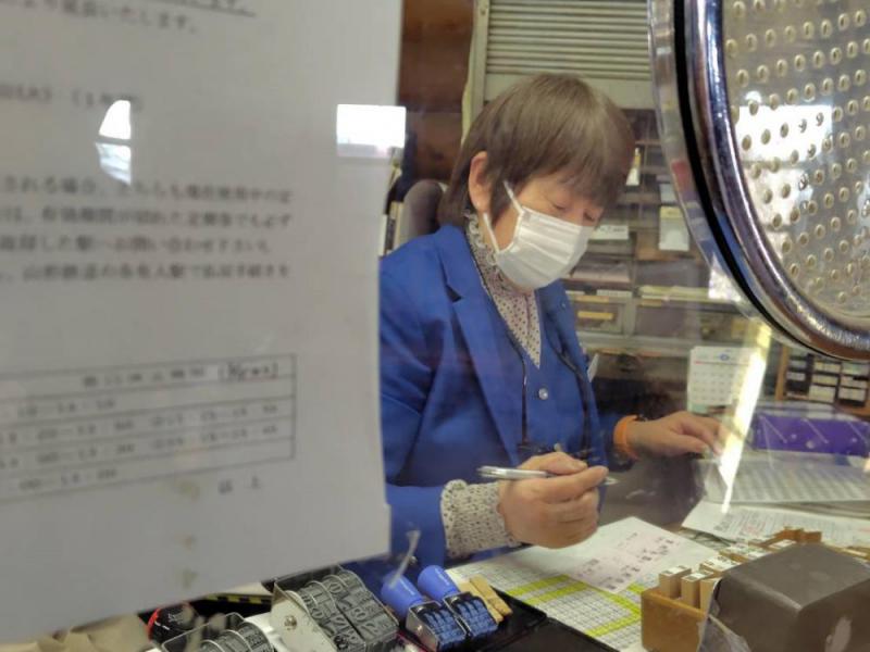 7月11日から開催してきた「7人展\ 〜 頑張れ!山鉄」も今週の日曜日で終了となる。今回「7人+ハート展」としたのは、ポスターの写真を提供してもらったNanaさんを含めていたのである。そして、展示会の結びにもNanaさんの写真を提供してもらった。  ポスターの写真には、赤湯駅で仕事をする山形鉄道の運転手の姿がある。そして上の写真には、窓口で業務をしている女子社員の姿がある。山形鉄道の運転手は車両の整備作業も行っているという。そして女子社員も窓口業務、団体客のアテンダント、山鉄グッズの企画販売など2役、3役もこなしているのである。  今年になってから山形鉄道には厳しい状況が続いているが、こうした社員の姿を忘れないようにしたいと思う。自然に「ご苦労さん」、「ありがとう」という言葉が湧いてくる。「応援する」ということは、「感謝する心」から生まれるものかもしれない。この企画展の結びに伝えたい。  山形鉄道の皆さん、ありがとう!  頑張れ! 山鉄!