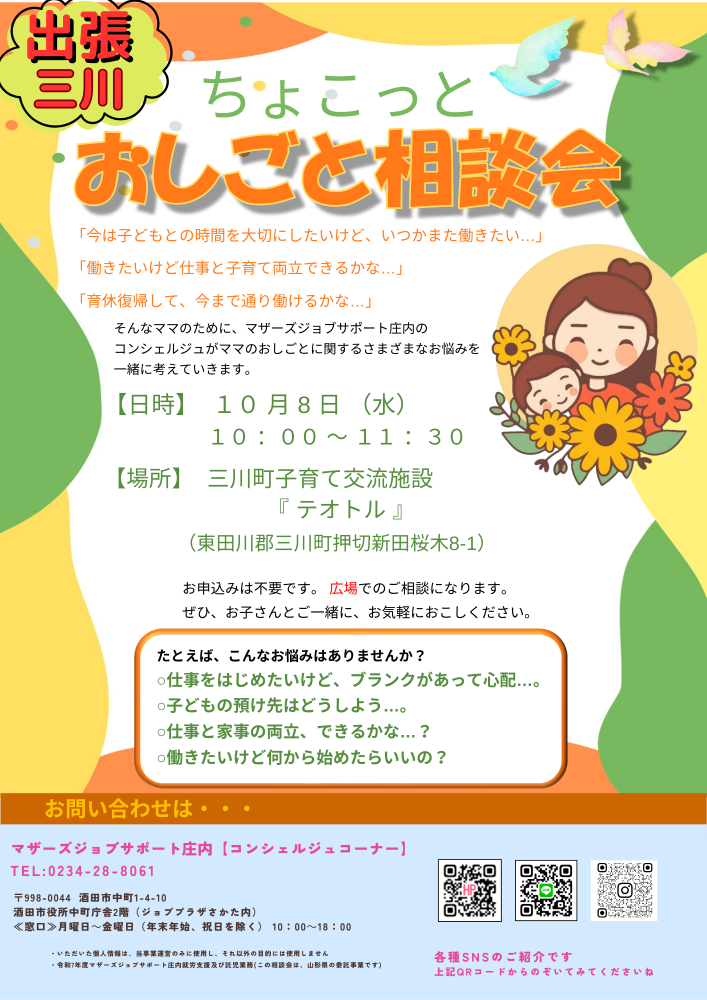 「おしごと相談会」10月開催のお知らせです*.:・.。**.:・.。**.:・.。**.:・.。**10月8日(水)@10:00〜11:30 『ちょこっとお仕事相談会!』そろそろ働こうかな...いつか働こうかな...この働き方で続けていけるかな...そんなママのためにマザーズジョブサポート庄内のマザーズコンシェルジュがママのお仕事に関するさまざまなお悩みを一緒に考えていきます一緒に不安を解消したい方、ご興味のある方、ぜひ、ご参加ください(^^)/お申込みは不要ですぜひ、お子さまと一緒にお気軽に遊びに来てください(^^♪【場所】三川町子育て交流施設『テオトル』(東田川郡三川町押切新田桜木8-1) どうぞ、お気軽にお問い合わせくださいね。◇お問い合わせ◇マザーズジョブサポート庄内TEL:0234-28-8061☆★☆コンシェルジュコーナーでLINEアカウントやっております♪ ☆★☆セミナーのお知らせや、お問い合わせ、お申込みにも対応しています♪ぜひお友達になってください☆https://lin.ee/zBnhdYULINEの場合は「お名前、電話番号、申込み講座、託児の有無」を送信して返信をお待ちください