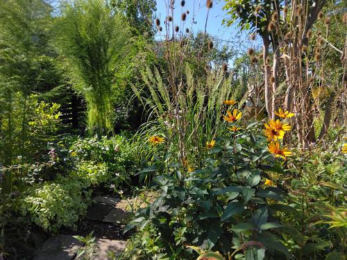 急に朝晩の冷え込みが…急激な寒暖差が、体に応えます。テレビから聞こえてきましたが夏バテから、秋バテ!ここ3年前頃から”秋バテ”なんて言葉が出てきたようです。 ここ長井の19日の朝は、14.9℃!前日よりも7℃も低く、暖房オンにしたかったくらいですが、じーじは半袖短パンの格好、この体感の違いはなあに?去年は9/22に初めて暖房オン、早かった…いつものお天気おばさんの話が長くなってしまいました。 さて、庭はグラスですっかり秋!19日の朝は寒かったですが、朝の日差しでグラスのキラキラ感が凄くて庭グル〜と、撮りまくってしまいました。 トップ写真も秋らしく、自然の風景が撮れました。 ↓我が庭で一番の見応えのある代表選手!”ペニセタム グリーンスパイク”チカラシバの一種でコボレダネで繁殖するので余計な分は抜くようにしています。 ↓ウイスキー樽鉢でおなじみのグラス”ペニセタム モードリー” ↓“ペニセタム カーリーローズ” ↓“スティバ エンジェルヘアー” ↓”カラマグロスティス ブラキトリカ” おまけに。。。 切り戻しながら、まだ頑張っています。 ↓今の時期、一番きれいな色を見せてくれる”ハツユキカズラ”ミニガーデンに色を添えてくれています。 秋の庭、ガーデンマムが開いてこないと色が少しさみしいですね。もう少しの辛抱です。(^^)