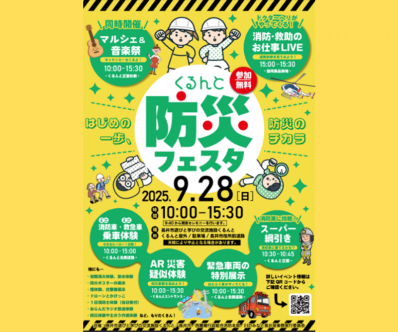 くるんと防災フェスタ2025くるんと防災フェスを今年も開催します!今年のテーマは『はじめの一歩、防災のチカラ』です。 開催日:2025年9月28日(日) 時 間:10:00〜15:30 (開会セレモニーは9時40分開始) 場 所:くるんと 長井市役所前※当日の天候や緊急事案の発生に伴い中止となる場合がございます。※開催中止の判断基準や案内方法についてはコチラ・駐車場: くるんと駐車場 約200台 長井市役所駐車場 約140台 市民駐車場 約100台 ※くるんとまで徒歩約8分 旧ヨーク駐車場 約130台 ※くるんとまで徒歩約3分 長井市役所駐車場(駅側) 約40台※各駐車場での盗難・トラブル・事故につきまして一切の責任は負いません。  〜イベントマップ〜 ☆イベント内容☆詳細はくるんとホームページよりご確認ください。 【屋外体験ブース】 防災ラジオ放送体験 スタンプラリー、防災展示、初期消火・煙体験 ミニ消防車乗車、放水・土のう作り体験 特設避難所体験、重機体験 ほか【はたらくクルマ展示】 パトカー、自衛隊車両、救援車、ミニ消防車など乗車体験もあり【エントランスホール】 AR災害疑似体験、パネル展示、映像視聴 消防士体力コーナー、缶バッジ作成、防災ワークショップ【あそびばイベントステージ】 防災クイズ・ダンス、ペーパークラフト救急車【スペシャルプログラム】 消防車との綱引き 防災ヘリ・県警ヘリの飛行展示 救助〜ドクターヘリ搬送の連携訓練ライブ実演【マルシェ&音楽祭】 キッチンカー、クラフト・雑貨、ワークショップ出店あり 体験を通じて学び、防災力を高められる1日です!皆さまのご来場お待ちしております(*'ω'*)