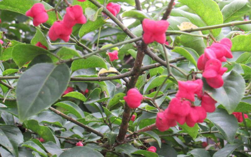 ●9月22日のブログで紹介した「セイヨウマユミ」が真っ赤に色づいていました 9月22日にはまだピンクがかっていましたが今は真っ赤に色づきぷっくと膨らんだ実がはじけて鞘がはじけて本当の実がでてくるそうです どこか愛らしい花木の一つですが動物が食べると死んでしまうほどの毒性があると知り綺麗な花にはとげがあるの例え通りと感心してしまいました